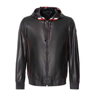 RARE威雅男装 秋冬新款黑色帽口红白撞色连帽男士时尚休闲皮衣